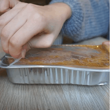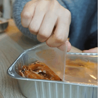 ding~漫長(zhǎng)的十分鐘終于過(guò)去了,撕開包裝盒,水蒸氣里凝結(jié)著醬汁,一股子麻辣鮮香撲面而來(lái)。